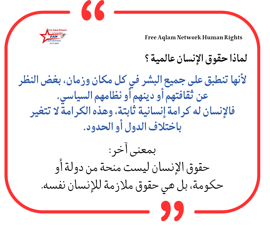 لأنها تنطبق على جميع البشر في كل مكان وزمان، بغض النظر عن ثقافتهم أو دينهم أو نظامهم السياسي.فالإنسان له كرامة إنسانية ثابتة، وهذه الكرامة لا تتغير باختلاف الدول أو الحدود.بمعنى آخر:حقوق الإنسان ليست منحة من دولة أو حكومة، بل هي حقوق ملازمة للإنسان نفسه .