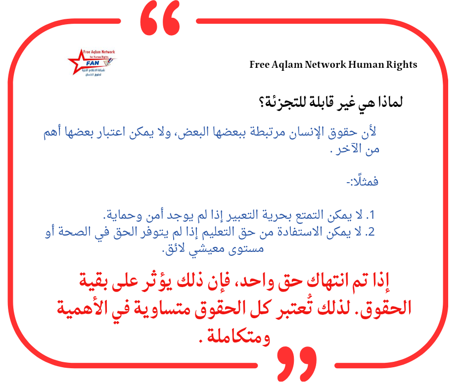 لأن حقوق الإنسان مرتبطة ببعضها البعض، ولا يمكن اعتبار بعضها أهم من الآخر .فمثلًا:لا يمكن التمتع بحرية التعبير إذا لم يوجد أمن وحماية.لا يمكن الاستفادة من حق التعليم إذا لم يتوفر الحق في الصحة أو مستوى معيشي لائق.إذا تم انتهاك حق واحد، فإن ذلك يؤثر على بقية الحقوق. لذلك تُعتبر كل الحقوق متساوية في الأهمية ومتكاملة .