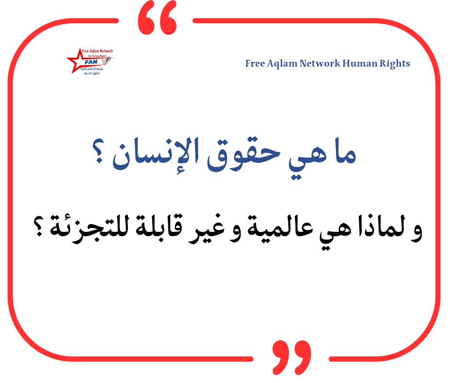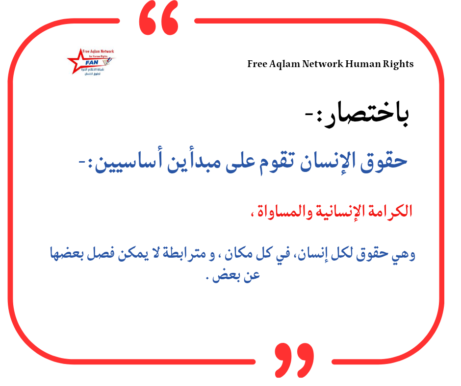 حقوق الإنسان تقوم على مبدأين أساسيين :- الكرامة الإنسانية والمساواة، وهي حقوق لكل إنسان، في كل مكان، ومترابطة لا يمكن فصل بعضها عن بعض .